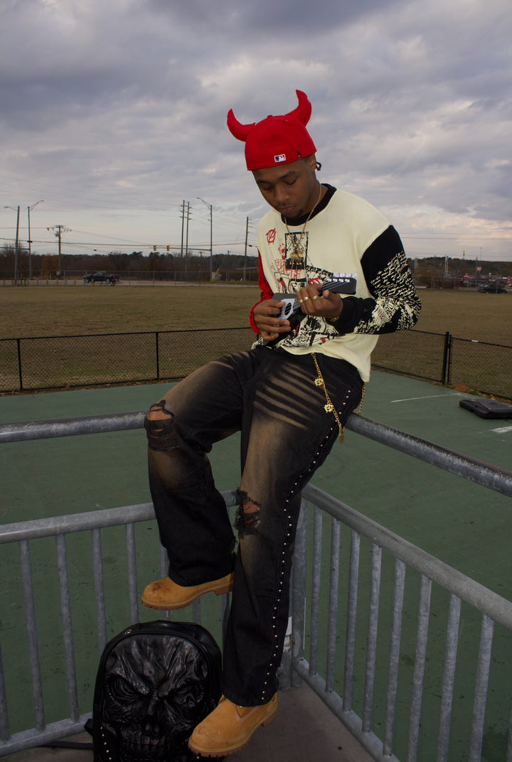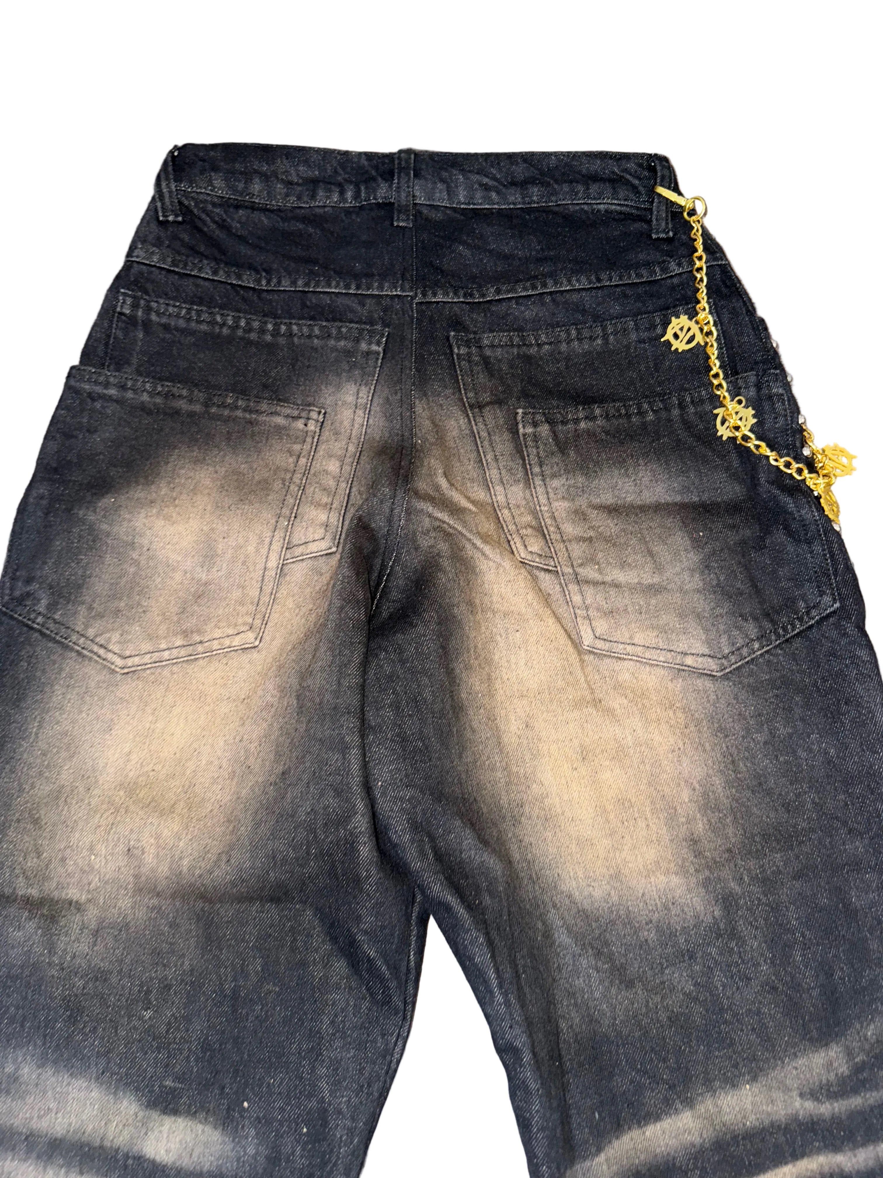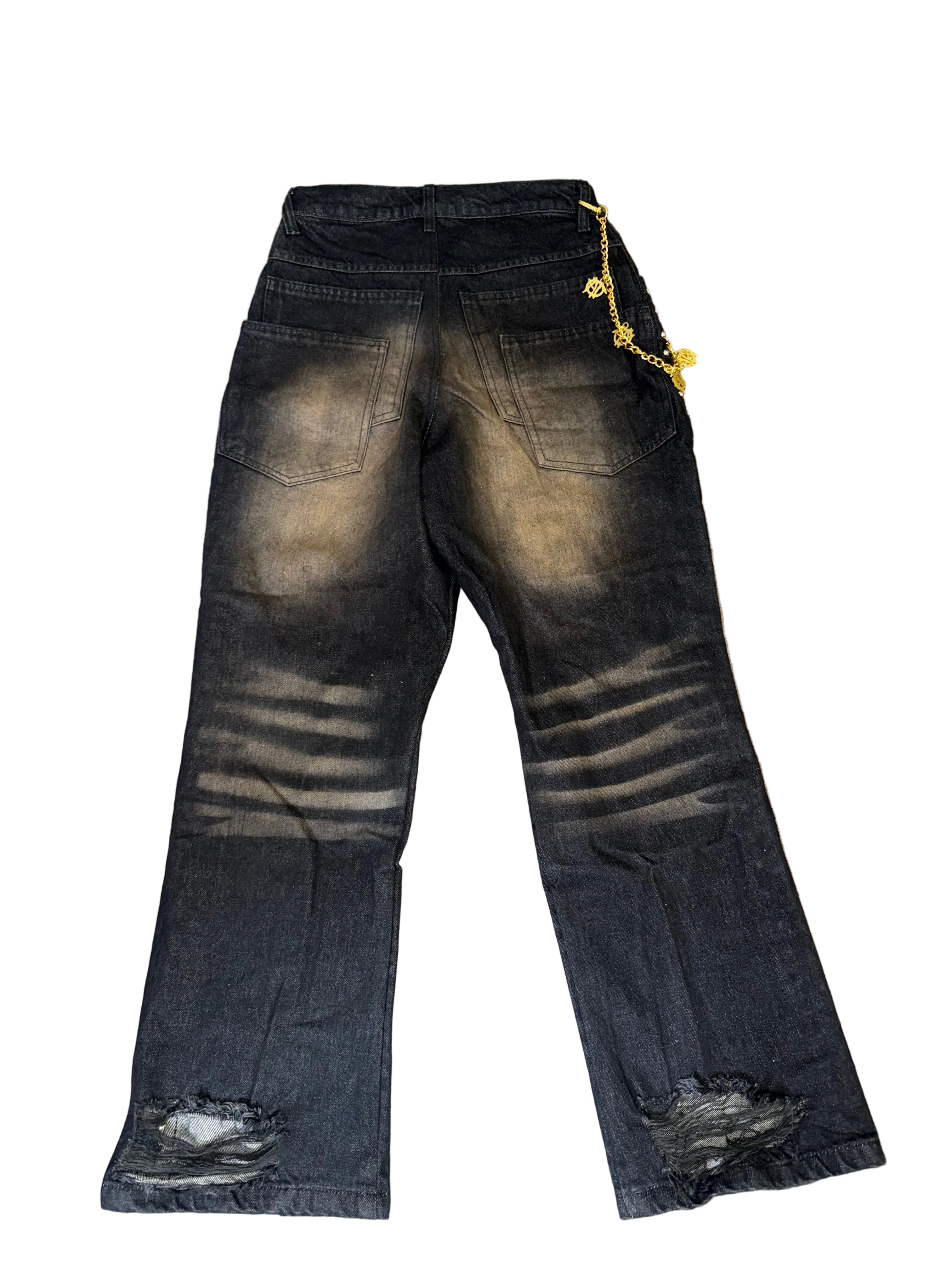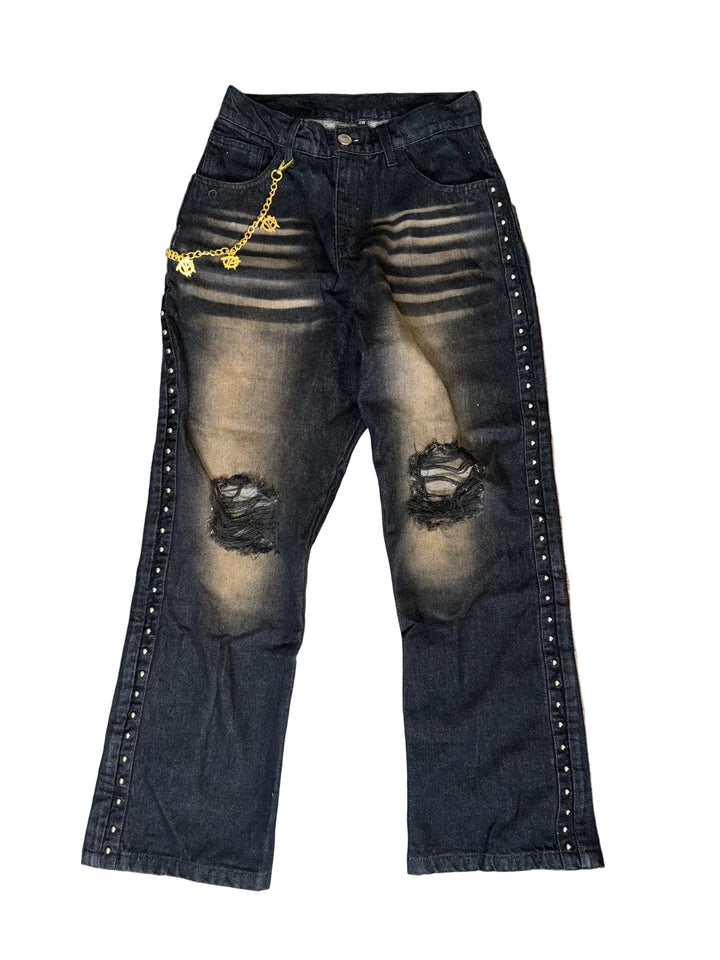Heavy washed black denim built with purpose.Featuring aggressive fading, knee distressing, double back pockets for structure, and studded side seams for edge.