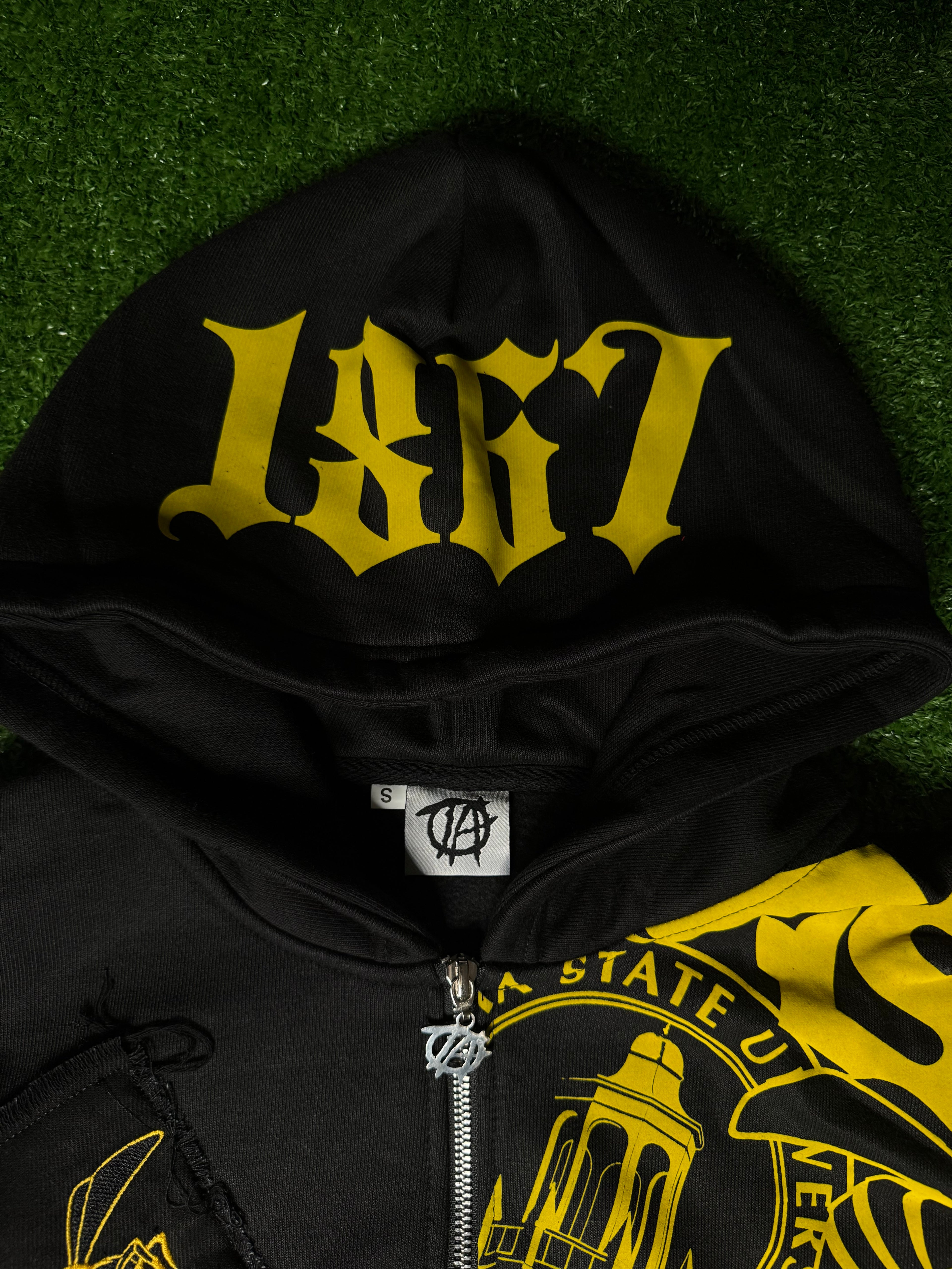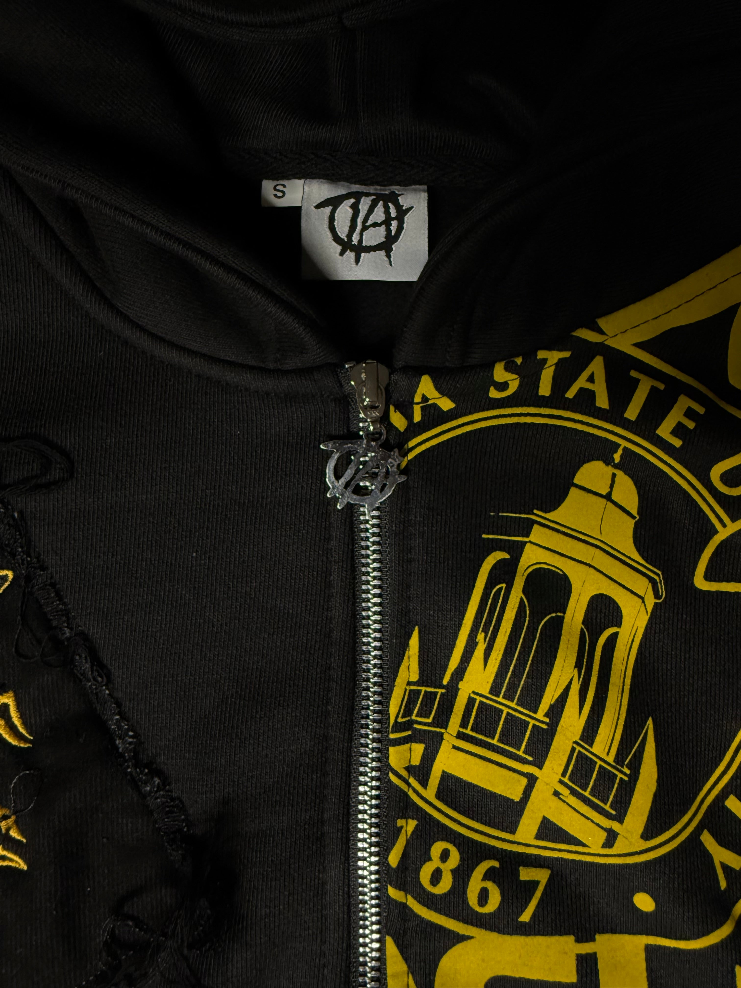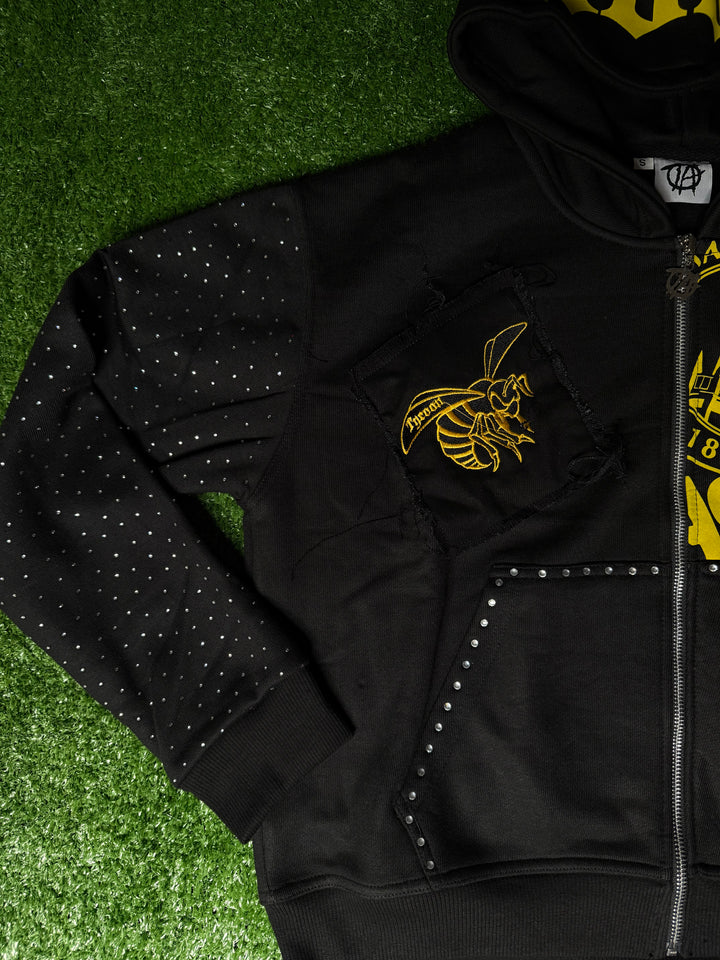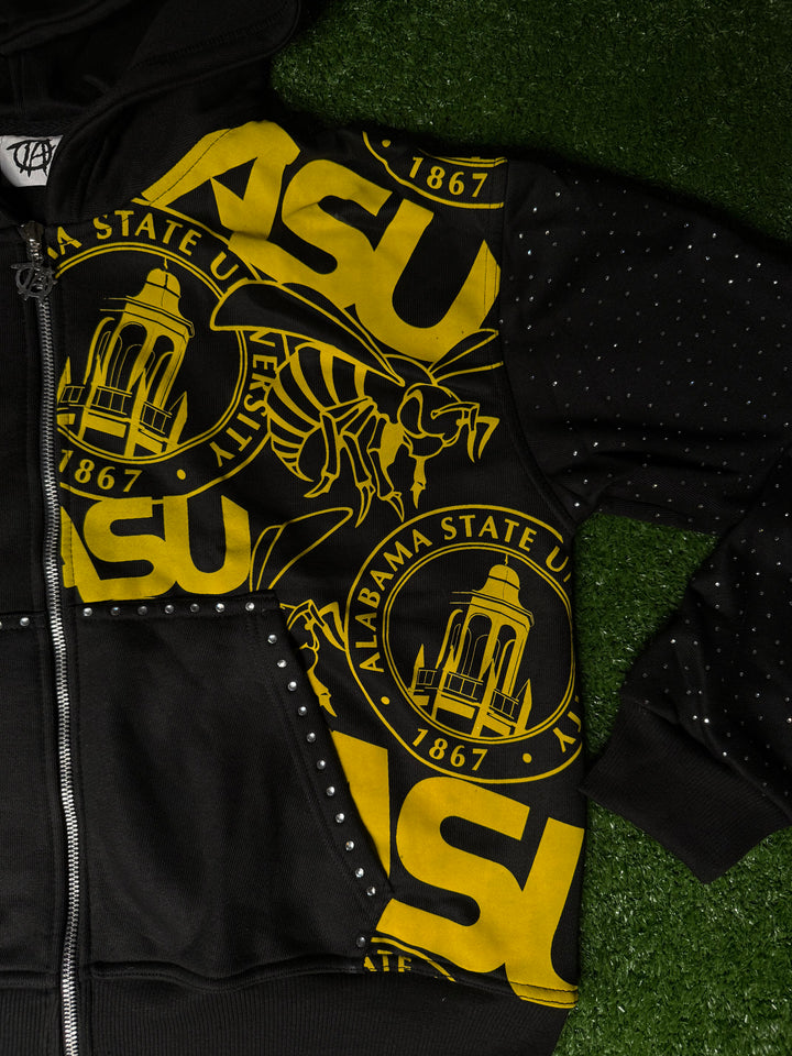 Stand out in this premium black zip-up hoodie featuring detailed embroidery of the Alabama State Hornets logo. Designed with style and school pride in mind, this hoodie is accented with sparkling rhinestones along the sleeves and pocket borders. Bold printed ASU logos complete the look, making it the perfect blend of comfort, fashion, and team spirit.